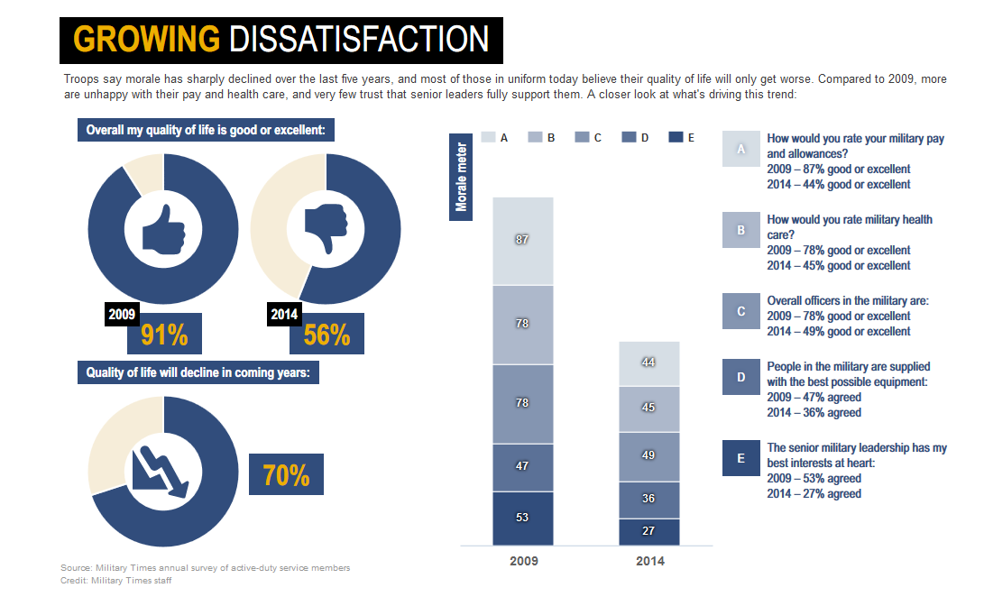 1. Morale indicators are declining in nearly every aspect of military life: lower overall job satisfaction, diminished respect for their superiors, and a declining interest in re-enlistment now compared to just five years ago.