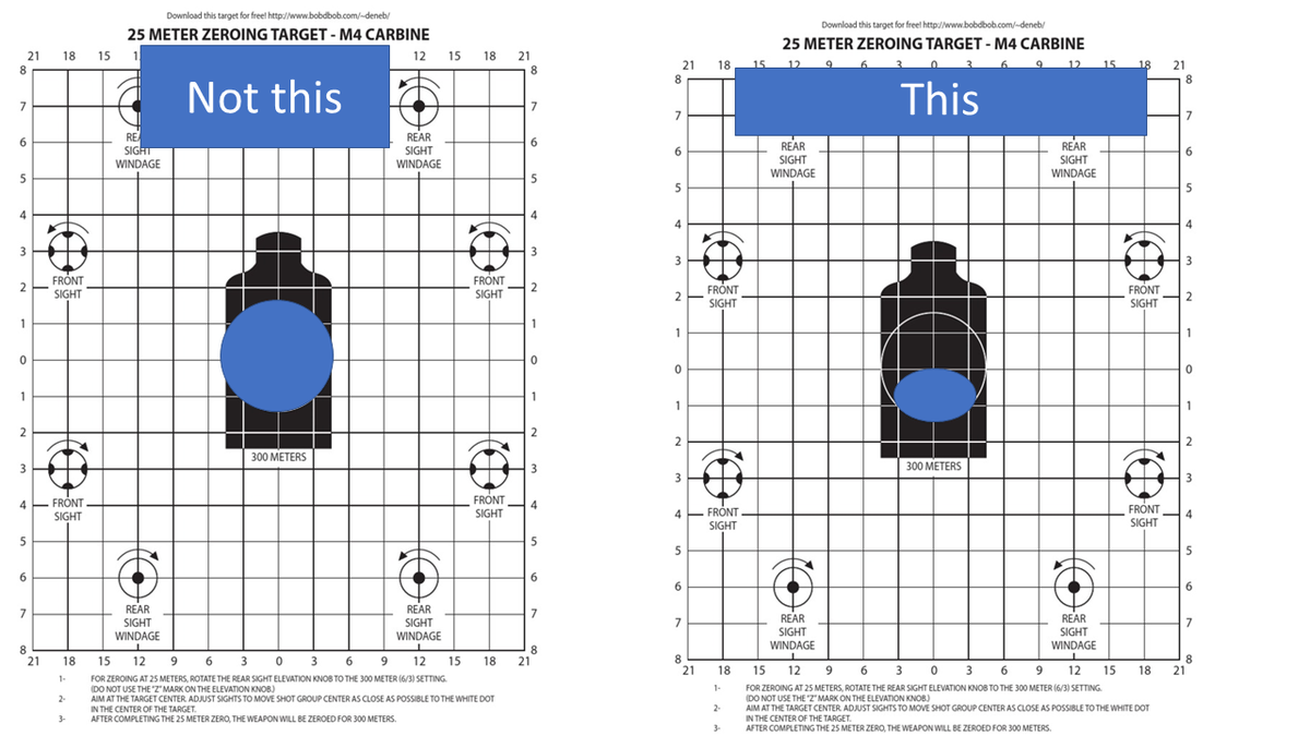 Understand the ballistics of a 5.56. At 25m you want the grouping at the BOTTOM HALF of the center circle in the zero target, not the dead center. This allows for at 300m to hit dead center mass due to the external ballistics of the round (they aren't exactly in line 25/300).