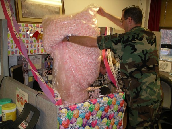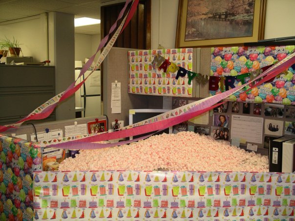 In exchange, they placed balloons filled with confetti in my office and sprinkled it all over my office.....vaselined under the door handles of my car. I DID get upset when they placed Vaseline on my windshield wipers because of the safety component, but everything else was done in good spirits.
