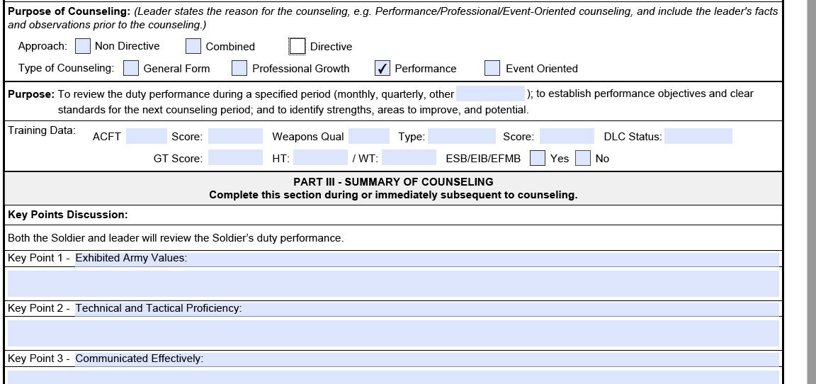 The initial counseling is really your roadmap to the Soldiers assigned to you for meeting your Commander's intent during the rating period. It is important to know exactly what performance objectives your rater and senior rater have for your section. You should also get a copy of their support form.