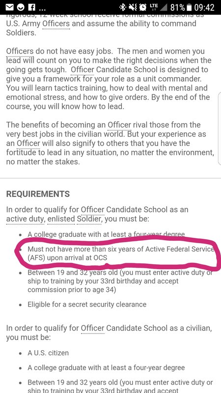 Are you saying you would have to attend OCS before your 6 year mark in service? If so, that's not right. Unless it's changed. I was in IOBC with a guy that came out of OCS and he had been in for 17 years.