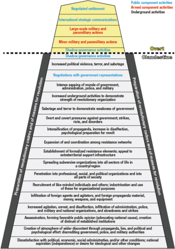 I used to teach anti/counter-terrorism and I would point out that a guerilla war is currently being waged in America that most people that are not familiar with guerilla war are oblivious to. This is the unclassified version of the Unconventional Warfare Pyramid. There are only minor differences and a couple of additions in the classified version. Read it and study it from the bottom up, then ask yourself, WHO is actually following this? It is not the right, conservatives or veterans. Veterans took an oath to Defend the Constitution against all enemies, foreign and domestic. IMO, most veterans will hold and support their oath to the Constitution. The situation we currently have is interestingly unique. Usually, it is a faction, undermining a government. In America, we currently have parts of the government, undermining the Constitution, which is the founding documents and foundation of that government. In addition, we have parts of Law Enforcement and the DOJ, clearly (and provable) violating the Constitution and giving favoritism to specific bodies, organizations, persons and groups while clearly making examples of others that do not follow their agenda. If this continues, you will have a breakdown of the entire judicial system, and anarchy will ensue. The judicial system, and the promise of equal justice , according to the Constitution, has been what held this country together for 247 years. When the judicial system breaks down and favors one part of the population, it creates massive animosity from the other parts of the population and the country as a whole WILL devolve.