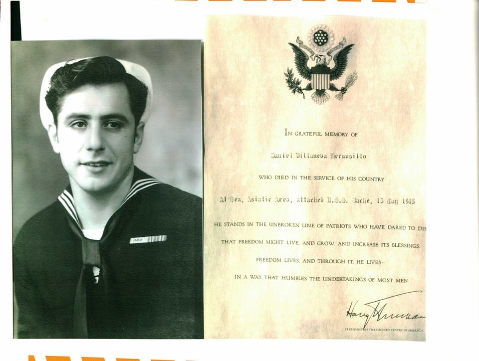 On Memorial Day, we remember the fallen in our country's service. My uncle, Daniel Villaneva Hermosillo, died when the USS Bache (DD-470) was hit in the last Kamikaze attack on a US Ship in WWII. His mother, my grandmother, was so distraught that she did not allow my mother to ever mention his name. I did not find out about him until after my mother's passing a few years ago. Like so many lost in WWII, his heroic sacrifice is what we remember on Memorial Day.