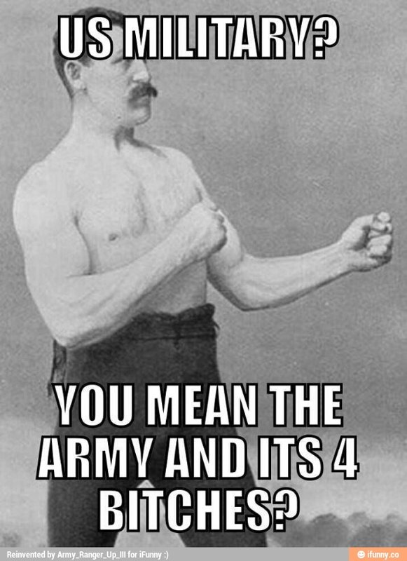 Just my take, and I may be completely off. I pray that my fellow soldiers, airmen, Coast Guardsmen and sailors do not get offended, because when it all comes down to it and rivalry becomes an issue, everyone better remember that the military is like human physiology, where if one system of the body shuts down or doesn't function properly, THE OTHER SYSTEMS WILL SUFFER. It is the same way for the sum total of our military; when one suffers, we all suffer.