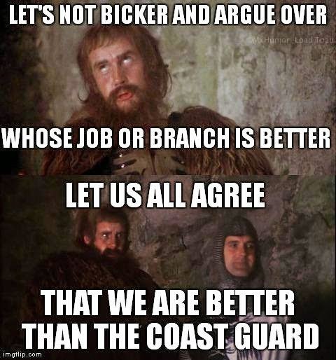 It takes Jarheads to storm the beach and secure area to move forward...It takes grunts on the ground to continually hold it...it takes flyboys to provide cover to ensure freedom of maneuverability...it takes squids to keep the seas and lanes open and to fly interdiction...it takes puddle pirate coasties to ensure borders are safe and international shipping laws and lanes are open. In all seriousness...each service is the expert in their field of operation and are superior in that field of operations. But none are more superior than the other as a service. Too many joint operations rely on the best of each branch.