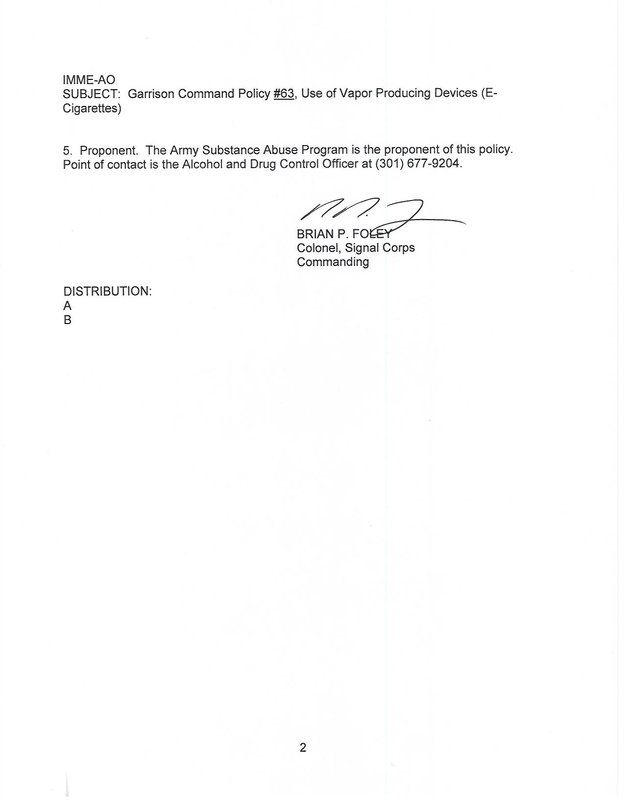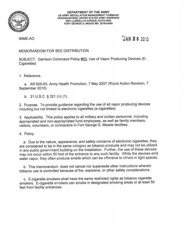 SSG Kenneth Lanning though I smoke, I don't see the e-cig as a "smoking cessation" tool, I think you are substituting one habit for another. Here in Ft. Meade, Garrison CDR sent a Policy about it's use and in it, it is considered a tobacco product just as regular cigarettes. Here the Policy in case you don't have it on hand.