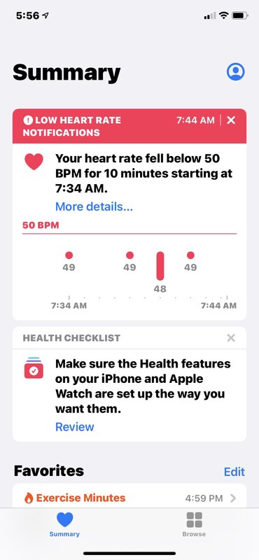 Cpl Vic Burk My Apple Watch alerted me for a low heart rate this morning. The Cardio MD advised me to set the watch at 50 and to use the Watch’s EKG function to make a record.