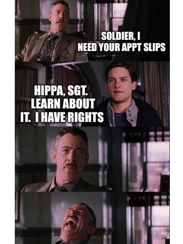 For real???? Wow... Anyway it's not. There's a HIPAA military command exemption even if there was. How does one think a commander can figure out if his troop is medically fit for duty if he can't even ask for an appt slip?