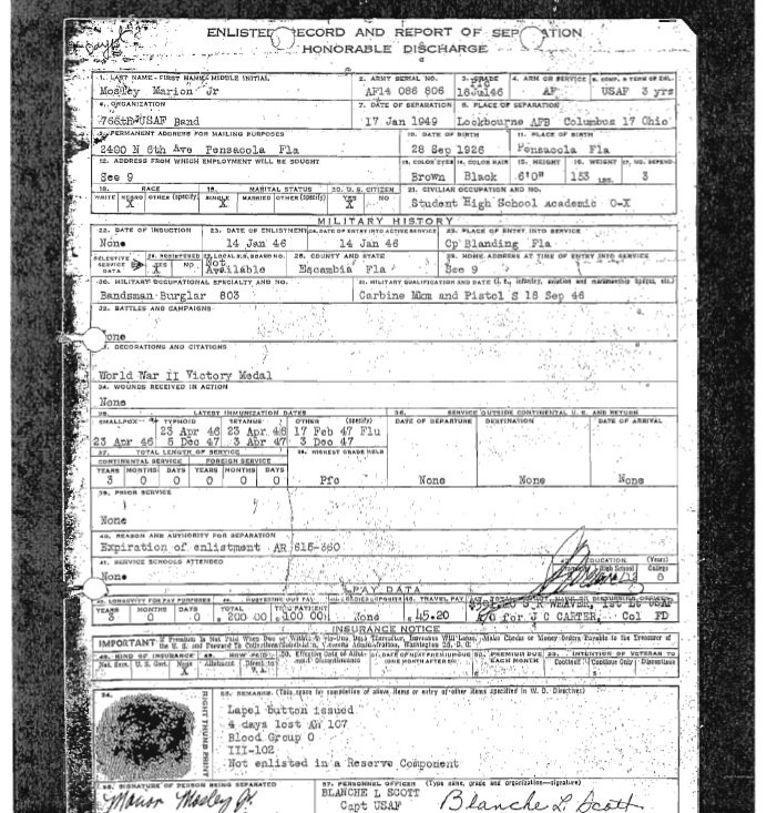 Marion was in Italy from 1944 -1947. Marion played trumpet in the 766th Army Air Corp Band which traveled the country from 1948 -1949. Marion returned to the U.S. In 1949 while joining the Air Force Reserves in 1950. Marion was Honorably Discharged on January 14, 1951 and he served for 8 years in the Reserves.