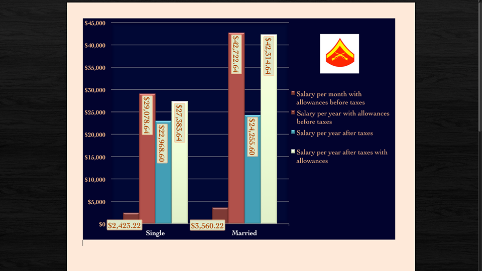 This chart represents the salary differences over the course of 1 year between two E-3s (Lance Corporals) in the Marine Corps. They both are stationed at Camp Lejeune, NC, and are identical to one another in every way (both have 3 years time in service) except one is single and one is married. Both Marines make as of the 2015 Military Pay Chart, approximately $24,663.60 per year before taxes. The single Marine is required to live in the barracks; he does not rate BAH. The married Marine rates BAH if no housing is available on base (which is not uncommon).