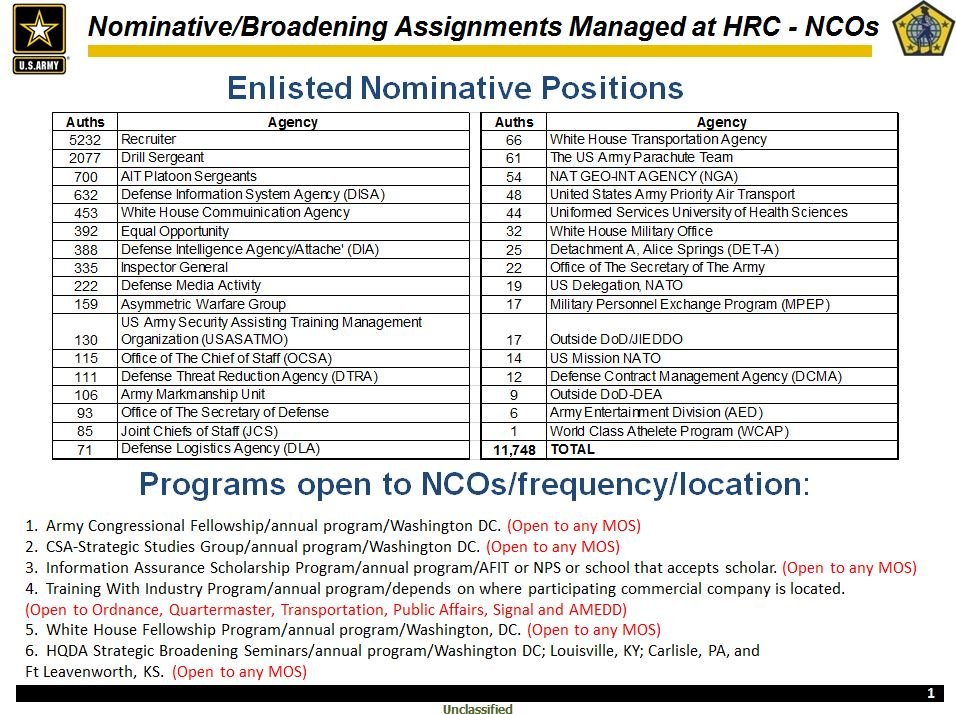 In my experience as a Senior Non-Commissioned Officer, upward movement seems to stall out after a while. I feel that most of us that have made it to this level have served in some capacity as a Drill Sergeant, Recruiter or Instructor. I believe that Officers have an advantage in the fact that there are staff positions at every level as they advance. Most recently, My CSM brought up the topic of nominative and broadening assignments that are available to Senior NCO's. Has anyone served in one of these positions and how did you go about getting that assignment?