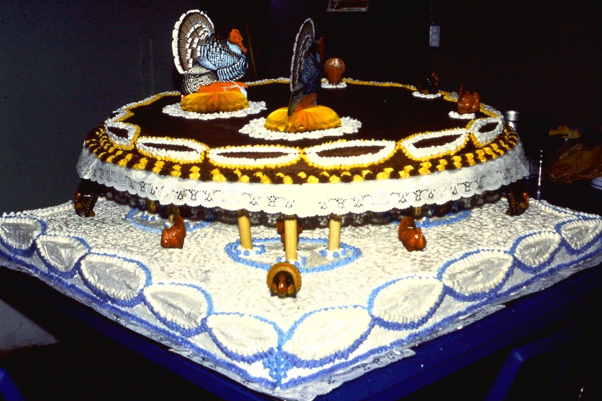 The base of this cake is four foot by four foot - took hours to bake and decorate. Just part of Thanksgiving Dinner in Merrell Barracks, Nuremberg, Germany.