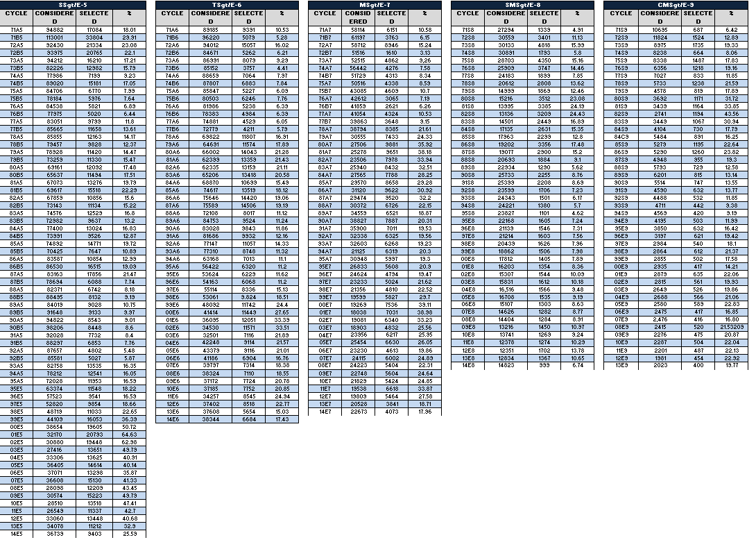 Lt Col (Join to see) attached is a chart of the historical promotion percentages by Rank and Cycle.
