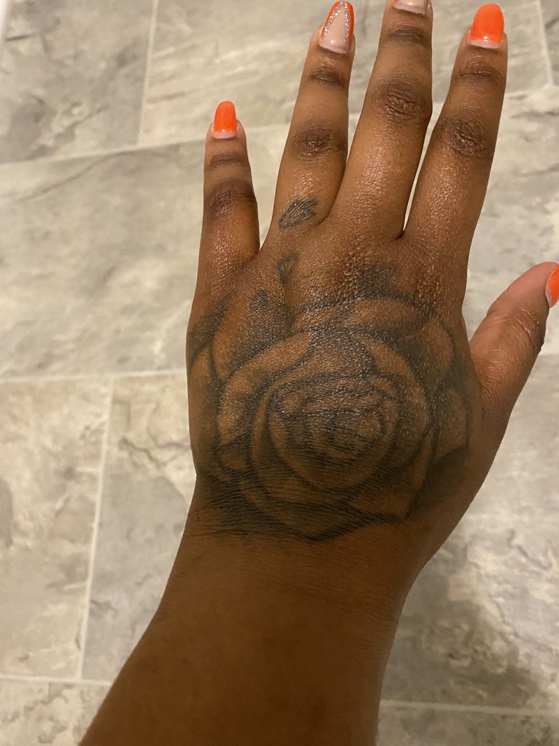 Chances are not good since you have it on your hand and it is that big.....be prepared to be told it was denied. Only tats on the hands that are allowed are ring tattoos