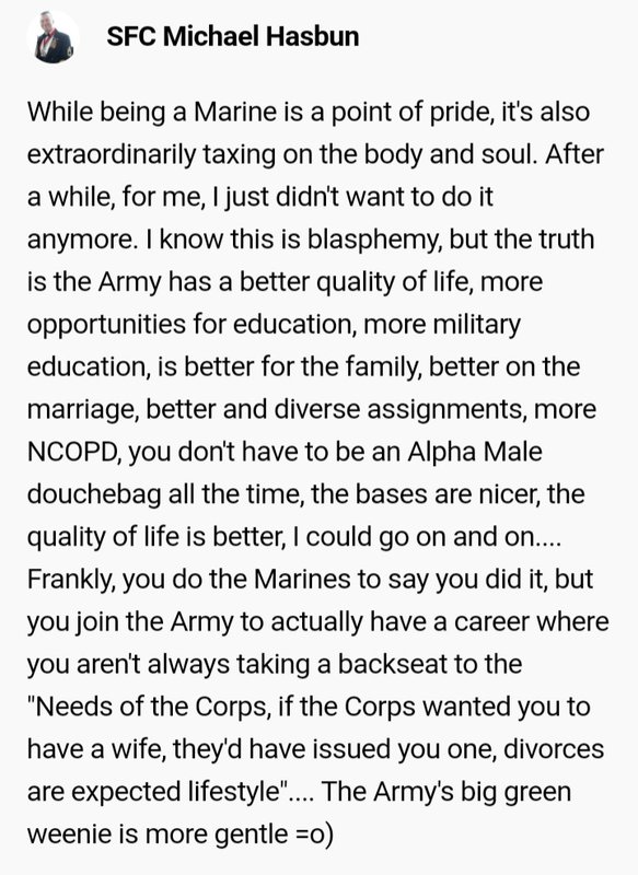 The thing about being in the Air Guard Security Forces...you end up getting to know people who were in everything else that’s out there as far as active duty combat arms from every branch...they just happened to get done with active duty but still needed a piece of the action once in a while...but from a hotel because they’ve had enough of the relatively rotten living quarters. My experience in talking with these people is that the least complaints and the most pride about their time in service came from the Marines. Yeah, the USAF has the best living facilities and whatever but the morale and pride in the USAF SecFo (in comparison to just about everyone else) is junk, especially when compared to the navy and marines.