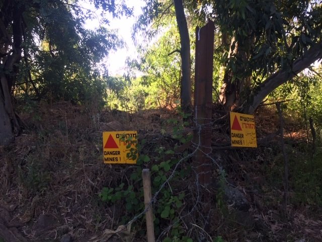After several kilometers, I arrived at a marshy wooded area named Einot Peham, an officially designated Nature Preserve. What else is officially designated is that this area is still also a marked mine field! The ubiquitous upside-down red triangle "Danger Mines!" signs were clearly written in Hebrew, Arabic and English, and posted right next to my path of travel. Another remanent left over from the Six-Day War.