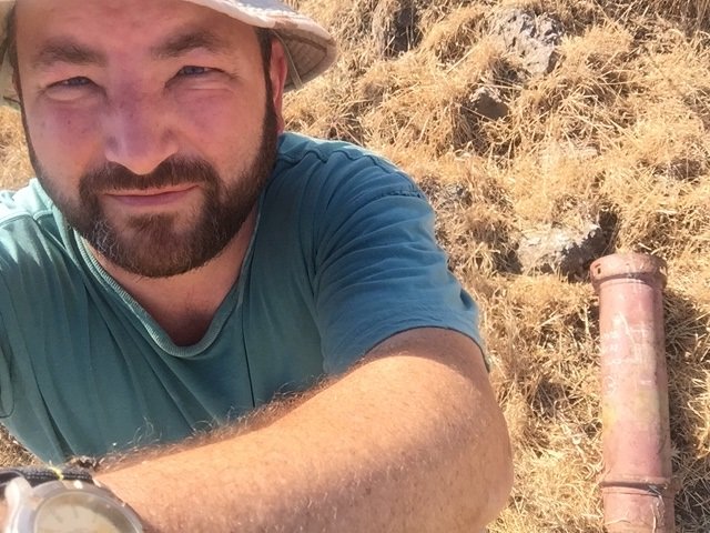 About 5 km later I came across another remnant of the war, an 105 mm artillery or tank shell carrier. The writing on it was Hebrew, but too blurry to read. One normally doesn't find such items outside of a firing range or military training area. Too bad that it was too big to take home as a souvenir. I did take a selfie with it.