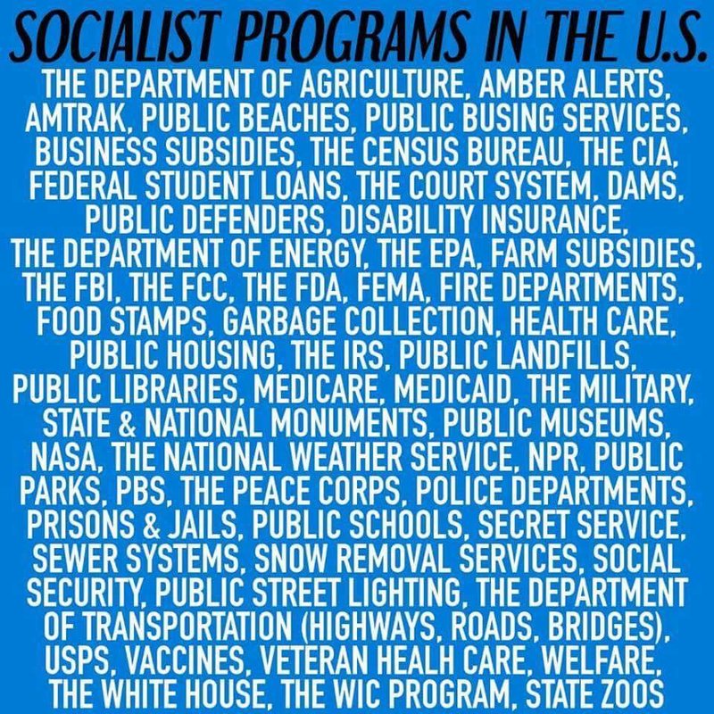 I was really disappointed to scan the initial responses and discover that no one has gotten it correct. Government programs are not "socialist". All you had to do was Google "socialism", then cut and paste the answer: "...a political and economic theory of social organization that advocates that the means of production, distribution, and exchange should be owned or regulated by the community as a whole."