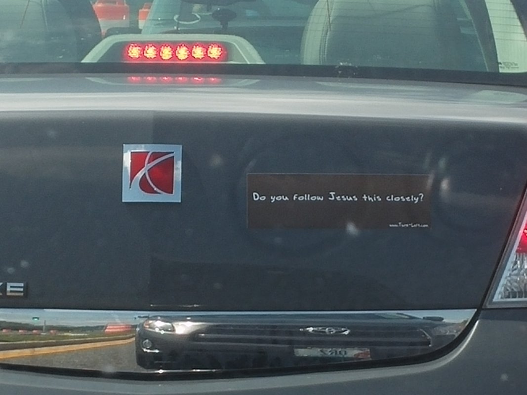 The irony is that the text on this bumper sticker was so small, you HAD to ride them up to be able to read it:
