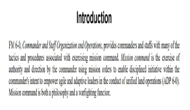 The format in FM 6-0 is provided to ensure that all factors which may impact the mission are considered. Paragraphs which are irrelevant may be omitted.