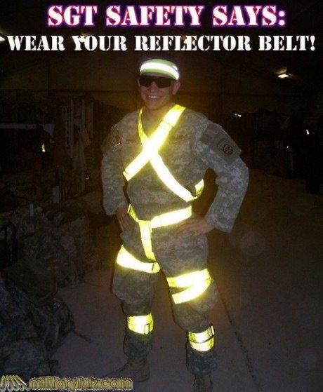 It's too bad the military can't just issue common sense instead of requiring ridiculous reflective belts or vests. It's too easy... First example: Look left. Look right. Is there a car coming? No? Good to go. Yes? Wait till it passes. Good to go. Second example: Massive machinery operating in low illumination areas around the FOB... Walk well around the machine... Good to go. Civilians manage to survive the terrifying streets of suburbia every day, I think Soldiers could someday, maybe, be trusted to do the same.