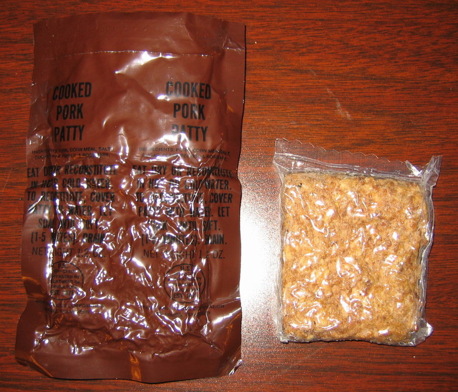 old school...dehydrated pork patty and its (not shown) brother, dehydrated beef patty. Eat them dry, drink a canteen of water...no more hunger for like two days.