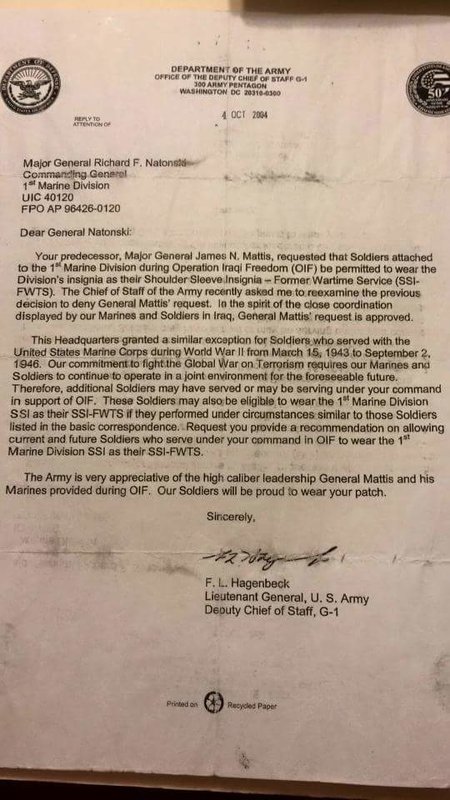 I am former US Army. But, during the Invasion of Iraq, my unit was assigned to the First Marines. We stayed with 1st Marine Division for about four months before being transferedback to our BN. So, I'm one of the few Soldiers that is authorized the 1st MD combat patch. Also, I was honored to serve with the Marines, USN, and USAF while in Africa.