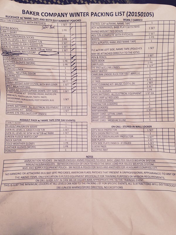 Being a squid, I was expectantly "intimidated" the first time I left the wire as the only sailor in company with infantry. I chose to go "light" but figured the critical elements were staying dry, warm and having a back-up plan. I kept a dry set of DCUs and undergarments in a dry-lock bag with the air squeezed out. Three pair socks in a smaller dry-lock. I private purchased a light-weight medium Z-bag which fit well on the understraps of my three-day pack. I took the contents of several MREs, removed them from the primary container and chose only the highest calorie portions to save space. Water. Lighter. I had a light weight, packable parka that could be worn under my DCUs and armor and a "beanie" for colder nights. "Survival" blanket. E&E bag that fit in my cargo pocket. Spare batts for my light, CQB scope and NVGs. Paracord. Light sticks, Light-weight poncho. Practical fixed blade knife. Needle/thread. I pint plastic bottle of kerosense. Five pipe cleaners and a collapsible toothbrush. In my load bearing vest, six mags 5.56, two mags 9mm, personal first aid, tactical flashlight, two zip ties, compass, small set of binos. From an Aviator friend, I obtained a small signal beacon that had a hood to select visible strobe, or IR only.