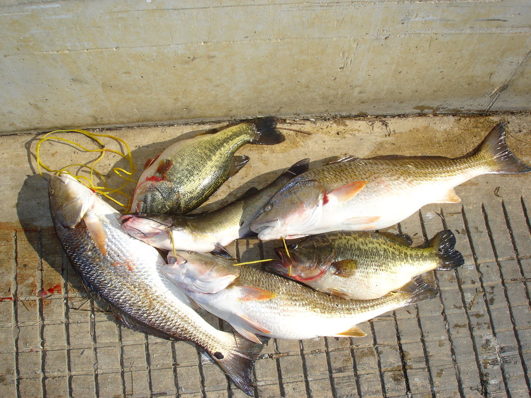 I caught these red drum, bass and catfish at Lake Calaveras TX about 40 miles south of San Antonio TX. I caught them on a fish head spin jig with a trailer hook on the damm by the power plant.