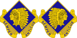 The 45th Infantry Brigade. One of the few insignia that is authorized a reverse image version (the Indian always faces forward). The blue field represents the infantry, and the Indian with war bonnet is the Oklahoma crest. The motto is "Semper Anticus"-Always Forward.