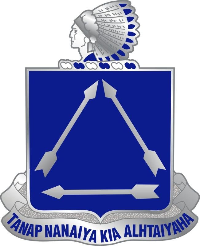 The 180th Cavalry Regiment converted from Infantry in 2010 and the infantry blue is still reflected. The three arrows are thought to represent the 180th's history as the 3rd Territorial Infantry Regiment. The motto is Choctaw and means "Ready in Peace and War"