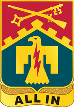 This one is close to me, I was involved in the design process. This is the 45th Brigade's Special Troops Battalion. It was a new unit and had no history of its own so the symbolism refers to the capabilities of the unit. In chief, the crossed key and rifle--the key representing the Military Intelligence company, and the Infantry that the battalion supports, the embattled chevron represents the Engineers. The thunderbird is shown with a thunderbolt on its chest, representing the Signal company. Red and gold reflect the Spanish heritage of Oklahoma and teal is the color for branch immaterial units. The motto, All In is representative of the employment ans mix of capabilities in the unit.