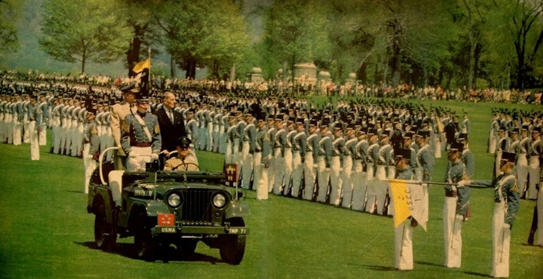 Not so much as having met but have at least seen in person, first the newly elected President of the United States, Dwight D. Eisenhower when our kindergarten Class watched His motorcade go by near My school on Pearl Harbor Navel Station where My Dad served in the US Navy. Eisenhower of course had held five star rank. Shortly after His farewell address to the Corp of Cadets at West Point I saw General Douglas MacArthur when He stood as reviewing Officer of the parade that followed that address. I watched as He rode a jeep, staning up holding a railing to troop the line across the front of the Cadet Corps in formation then proceed to the reviewing stand to watch the entire Cadet Regiment pass in Review with Him as the reviewing Officer. In both cases I had seen each of them they were in civilian clothes. Eisenhower wore a gray suit, MacArthur had on a black (or very dark blue) suit. The picture shown here is of that very parade with General MacArthur in the dark suit when that jeep was trooping the line. Notice the red plate with the five silver stars in a circle on the front of that jeep.