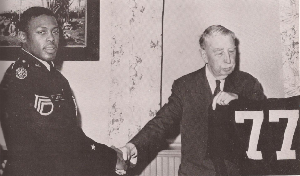 That Cadet, Floyd Douglas Little instead went to Syracuse University where He was also an All American. He latter played for the Denver Bronos and more recently became a member of the NFL Hall of fame. Floyd said He would like to have gone to West Point but Jim Brown anther well known Syracuse All American and NFL player talked him into going to Syracuse. The picture shown here is of Cadet SSgt Floyd Little having His jersey, number 77 retired at an athletic banquet with the Headmaster Dr. Harold Morrison Smith doing the honors. Cadet Little was the first player in the History of BMI to have His Jersey retired.