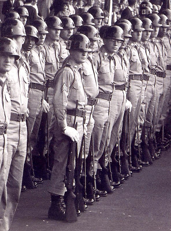 Prior to about 1966, U.S. Army wore Class A khaki uniforms in summer -- long sleeve shirts, service or garrison caps, ties & low quarter shoes. Khakis were sometimes worn in "under arms" configuration (parades, honor guard, interior guard, etc.) -- helmets, branch-color scarves, pistol belts, & boots.