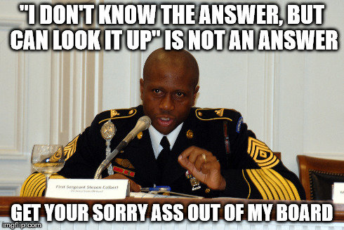 7. You were told by your PSG that Top wanted to see you in his office. The current temp outside his office is a nice 72 degrees....the moment you go in, it's 172 degrees and rising, and when you crawl out, it's below zero being you just got done sweating half your body weight.