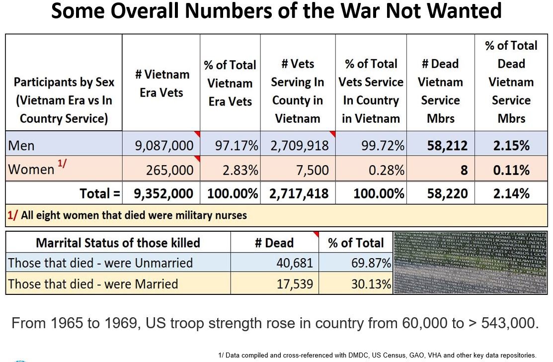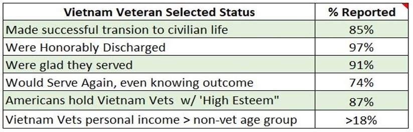 America has "appeared" to have grown-up understanding that the everyday individual service member today is in the military as a volunteer who serves their country and is not responsible for the making of national policy. They enter for many reasons, but they serve a nation whose ideal is to have “…a more perfect union…” That is why I have included a summary table of recent data regarding how people, including vets, view the Vietnam war via the lens of time. The data in the visuals provided in this response post, for those that want to know, have been compiled and cross-referenced with DMDC, US Census, GAO, VHA and other key data repositories for such data.