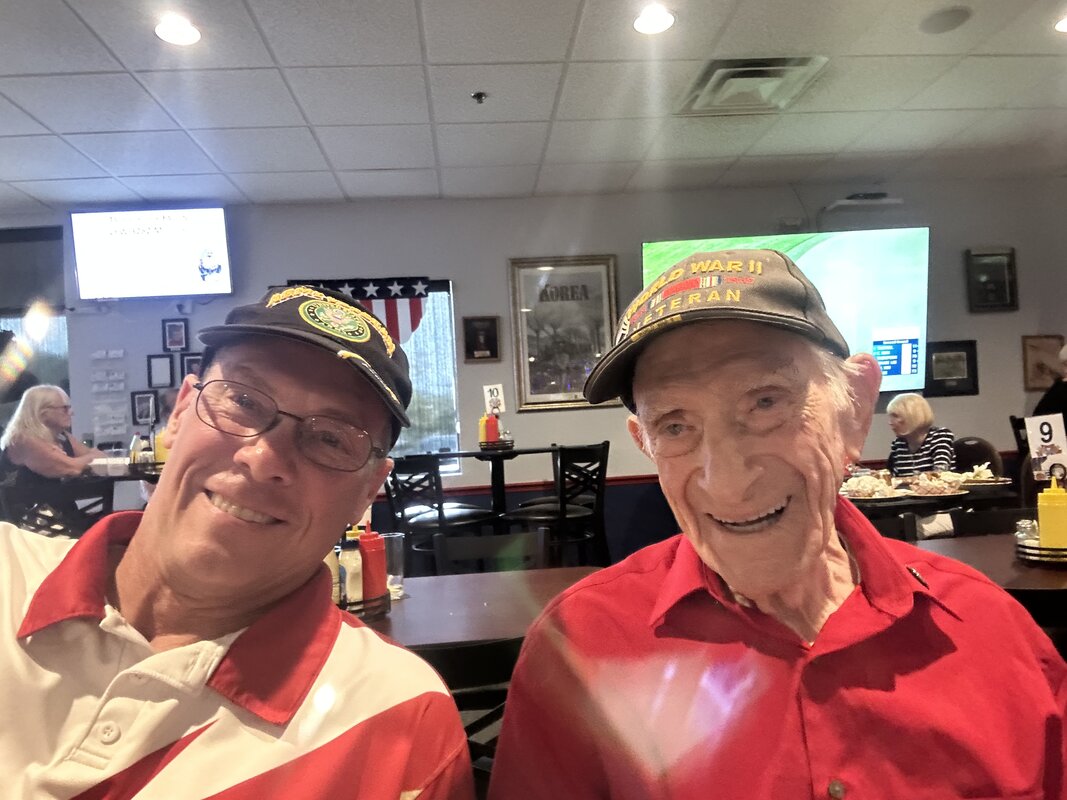Who inspires me on this Veteran's Day? The man on my left (your right) in this photo - Fred LaPonzia. WWII. Pacific Theater. Tail-gunner, B-24, Army Air Corps. 105 years old.