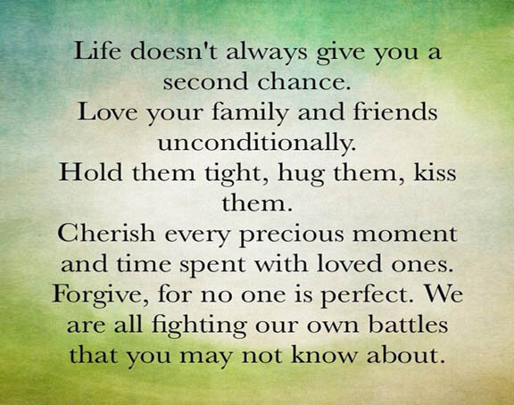“Life doesn’t always give you a second chance. Love your family and friends unconditionally. Hold them tight, hug them, kiss them. Cherish every precious moment and time spent with loved ones. Forgive for no one is perfect. We are all fighting our own battles that you may not know about!” — Unknown Author