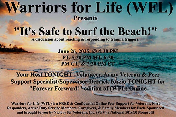 Warriors for Life (WFL) Online "Forever Forward!" edition presented by Victory for Veterans, Inc. (VFV) — Thursday (TONIGHT), June 26, 2025, @ 4:30 PM PT, 5:30 PM MT, 6:30 PM CT, & 7:30 PM ET
