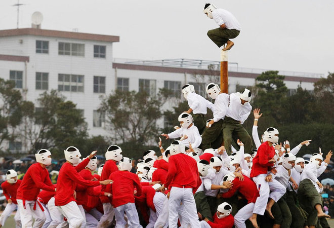 2. Bo-Taoshi is surprisingly simple. For one team, it’s defend a pole for two minutes. For the other, attack it and bend it to a 45 degree angle. Where the complications come in is in practice. Both teams attack and defend at the same time and contain 150 players, meaning there’s 300 guys beating each other to a pulp for two minutes. For protection, all you get is a padded helmet. Otherwise, it’s you and your clothed body smashing one human wall against the other.