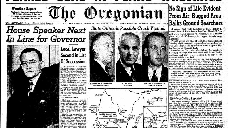 On Oct. 28, 1947, Republican Gov. Earl Snell, the State Senate President Marshall Cornett, and Secretary of State Robert Farrell Jr. boarded a plane to southeastern Oregon for some goose hunting. It was supposed to be a quick trip to a friend’s sprawling Lake County ranch. Instead, the small, private plane crashed into a ridge. All three politicians and the pilot were killed.