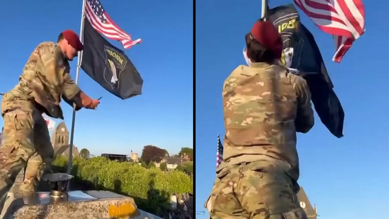 82nd Airborne paratroopers cut down a 101st flag from an iconic bar on D-Day