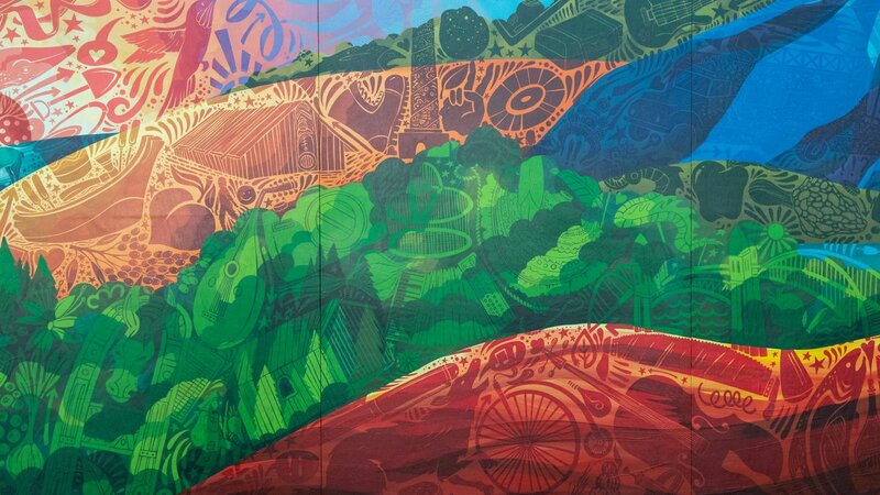 At first glance, Eugene artist Liza Mana Burns’ latest mural is a bright and colorful panorama depicting Oregon’s diverse landscape.