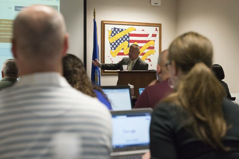 A benefits advisor briefs individuals participating in Transition Assistance Program classes at Wright-Patterson Air Force Base. (Michelle Gigante/Air Force)