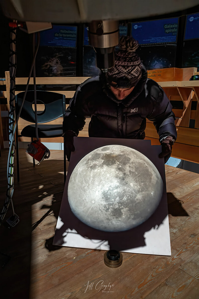 Explanation: You don't have to look through a telescope to know where it's pointing. Allowing the telescope to project its image onto a large surface can be useful because it dilutes the intense brightness of very bright sources. Such dilution is useful for looking at the Sun, for example during a solar eclipse. In the featured single-exposure image, though, it is a too-bright full moon that is projected. This February full moon occurred two weeks ago and is called the Snow Moon by some northern cultures. The projecting instrument is the main 62-centimeter telescope at the Saint-Véran Observatory high in the French Alps. Seeing a full moon directly is easier because it is not too bright, although you won't see this level of detail. Your next chance will occur on March 17.