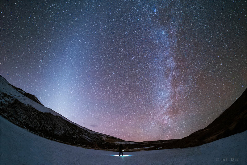 Explanation: "What are these two bands in the sky? The more commonly seen band is the one on the right and is the central band of our Milky Way galaxy. Our Sun orbits in the disk of this spiral galaxy, so that from inside, this disk appears as a band of comparable brightness all the way around the sky. The Milky Way band can also be seen all year -- if out away from city lights. The less commonly seem band, on the left, is zodiacal light -- sunlight reflected from dust orbiting the Sun in our Solar System. Zodiacal light is brightest near the Sun and so is best seen just before sunrise or just after sunset. On some evenings in the north, particularly during the months of March and April, this ribbon of zodiacal light can appear quite prominent after sunset. It was determined only this century that zodiacal dust was mostly expelled by comets that have passed near Jupiter. Only on certain times of the year will the two bands be seen side by side, in parts of the sky, like this. The featured image, including the Andromeda galaxy and a meteor, was captured in late January over a frozen lake in Kanding, Sichuan, China."