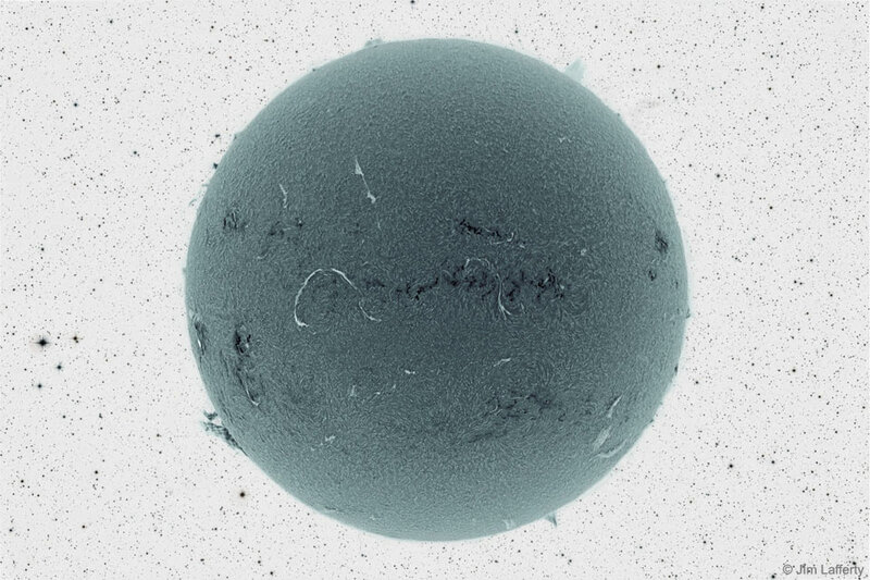 And they sure pop out here. The Hα-filtered light has been converted to black and white and then inverted. The same processing was performed on the star field in the background. Our Sun is one of many stars: "He telleth the number of the stars; he calleth them all by their names" (Ps 147:4, KJV). Cheers.