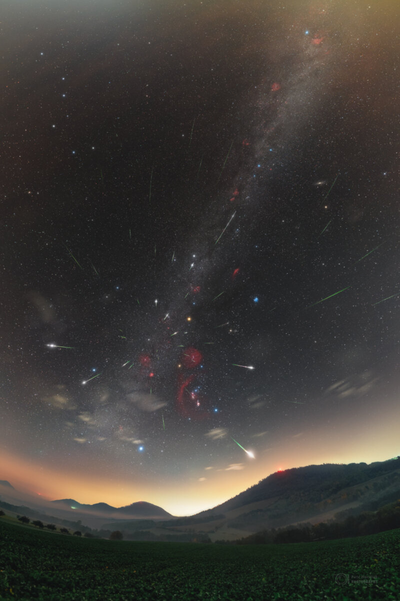 APOD 'Explanation: History's first known periodic comet Halley (1P/Halley) returns to the inner Solar System every 75 years or so. The famous comet made its last appearance to the naked-eye in 1986. But dusty debris from Comet Halley can be seen raining through planet Earth's skies twice a year during two annual meteor showers, the Eta Aquarids in May and the Orionids in October. Including meteors near the shower maximum on October 21, this composite view compiles Orionid meteors captured from years 2015 through 2022. About 47 bright meteors are registered in the panoramic night skyscape. Against a starry background extending along the Milky Way, the Orionid meteors all seem to radiate from a point just north of Betelgeuse in the familiar constellation of the Hunter. In the foreground are mountains in eastern Slovakia'