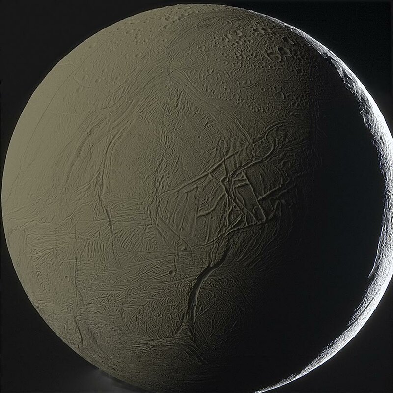 Image: Enceladus by Saturnshine; Image Credit: NASA; ESA, JPL, Cassini Imaging Team, SSI; Color Composite: Gordan Ugarkovic